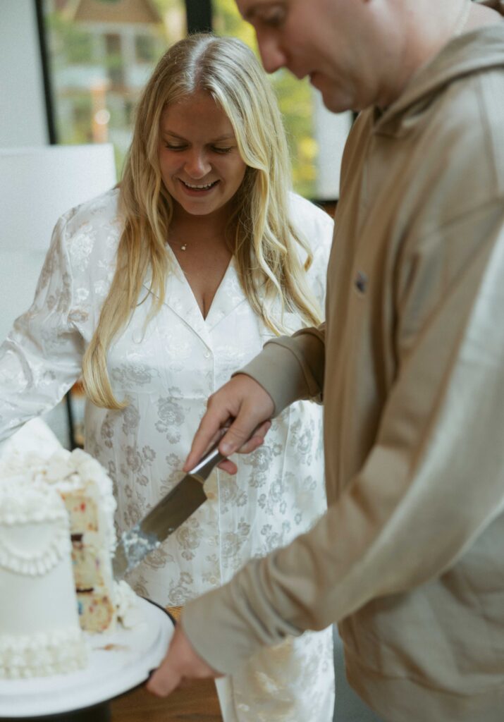Small, personal touches made the day uniquely theirs: Annie crafted her own bouquet from flowers picked at Pike Place Market, they shared mimosas in the parking lot with family’s champagne glasses, and after their ceremony, they BBQ’d and cut cake in their pajamas while watching football. The bride’s sister and her husband were included, making the day feel both intimate and shared with loved ones.